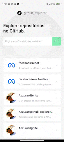 O projeto Github Explorer(app) é um aplicativo que consome a API do GitHub e exibe informações de qualquer repositório público a partir da busca pelo usuario/nome-do-repositorio, exemplo: facebook/react e usa animações suaves e didáticas com React Native Reanimated para melhorar a experiência do usuário. Além disso, podemos navegar entre as issues de cada repositórios e acessá-las apertando no card da issue que será aberto o navedor com a url da issue.