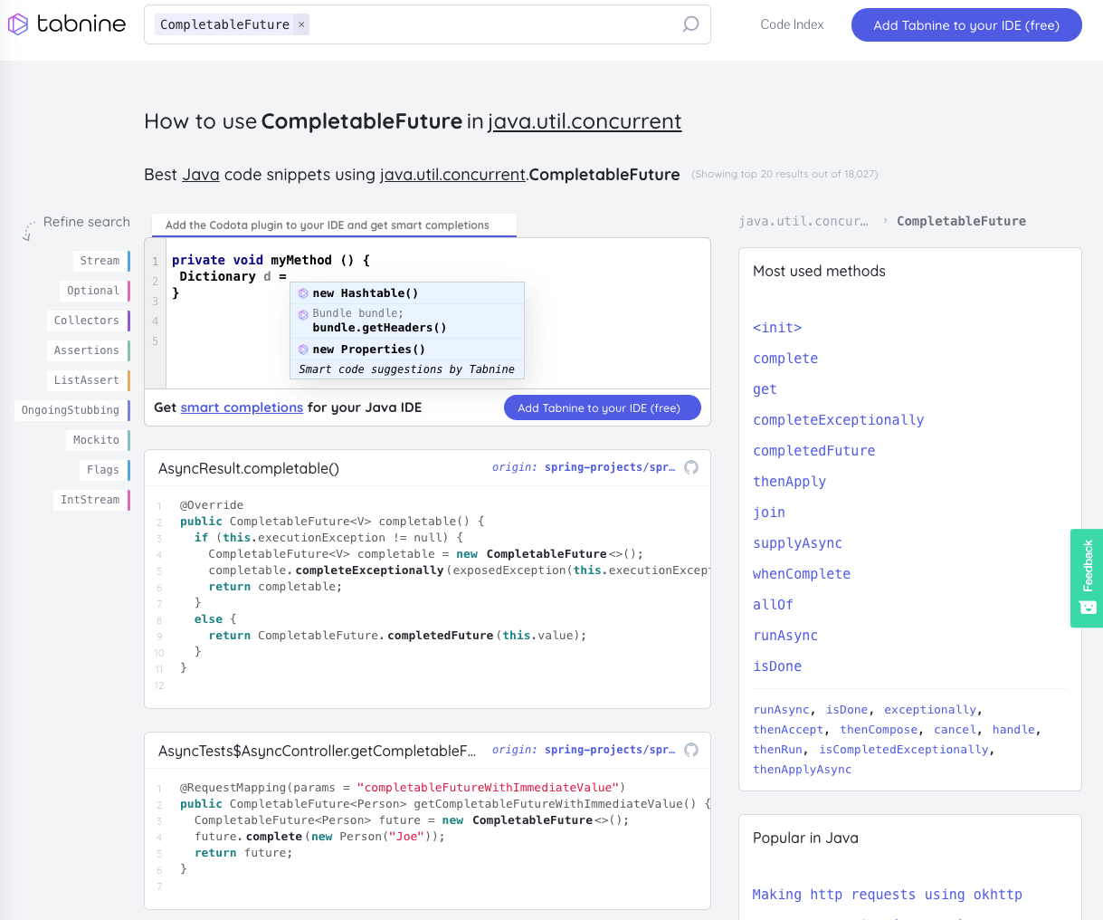 如果你觉得 IDEA 插件安装的太多比较卡顿的话,不用担心!Tabnine 插件还有一个对应的在线网站,在这个网站上你可以根据代码关键字搜索相关代码示例,非常不错!网站地址: https://www.tabnine.com/ 。