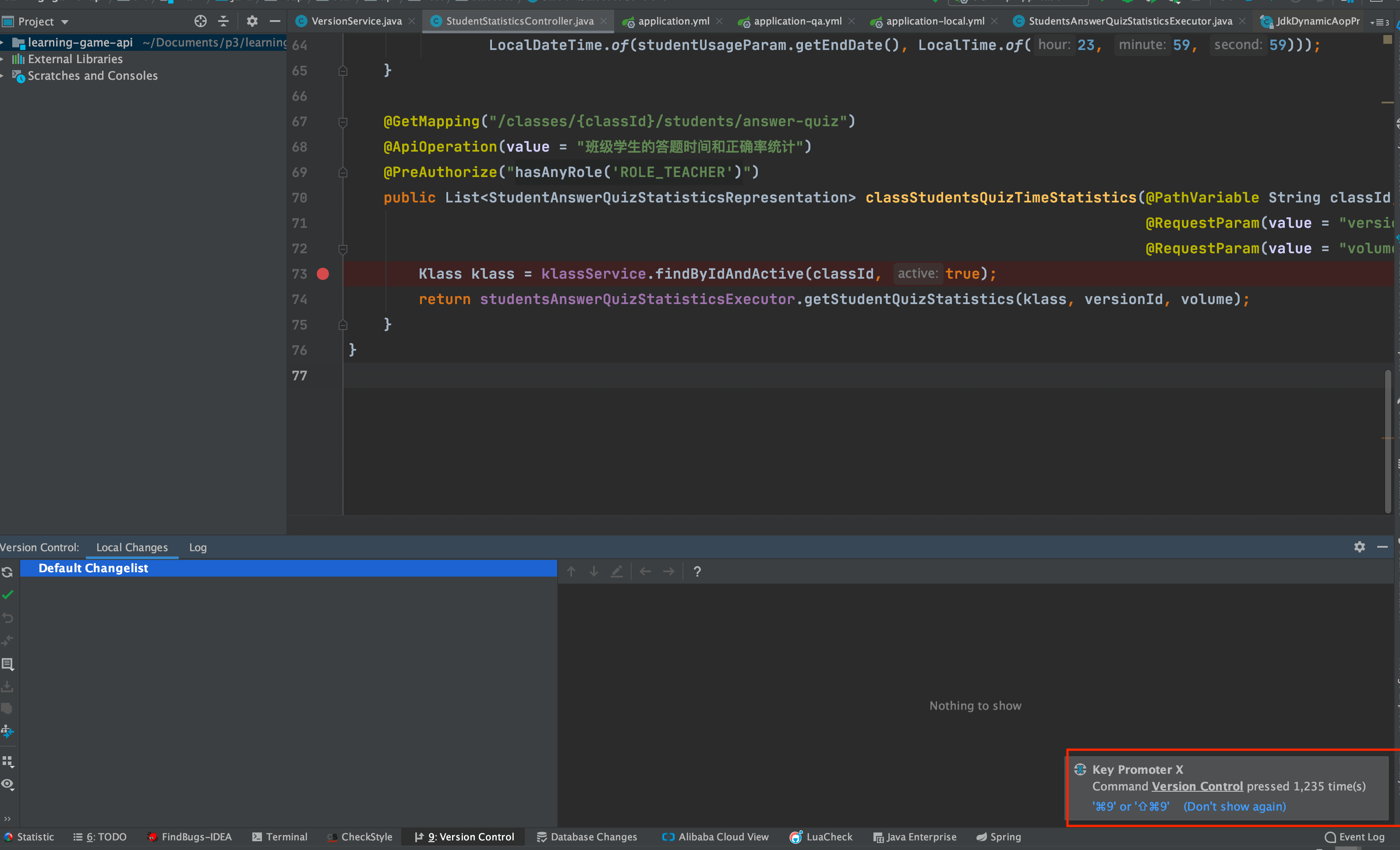 举个例子。我直接点击 tab 栏下的菜单打开 Version Control(版本控制) 的话,这个插件就会提示你可以用快捷键 command+9或者shift+command+9打开。如下图所示。
