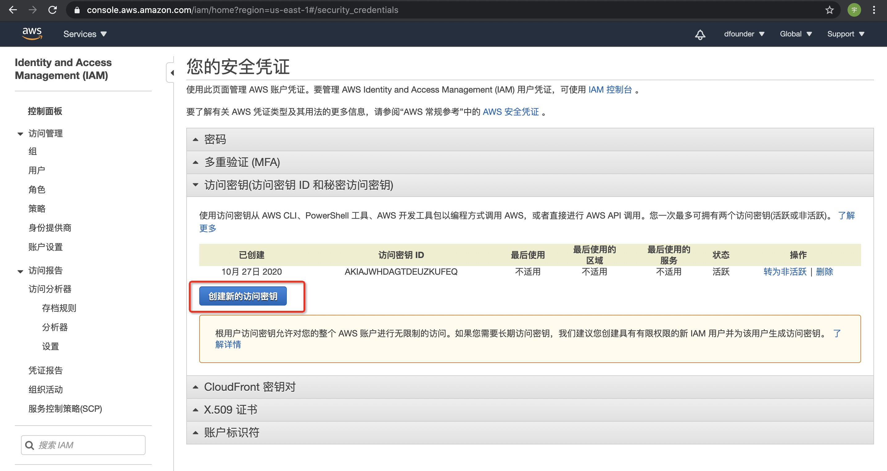 - 点击【访问密钥】,并且【创建新的访问密钥】: