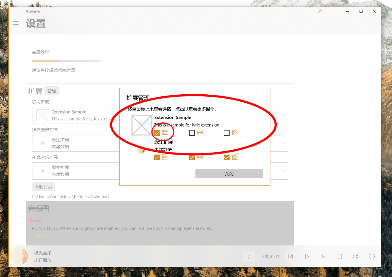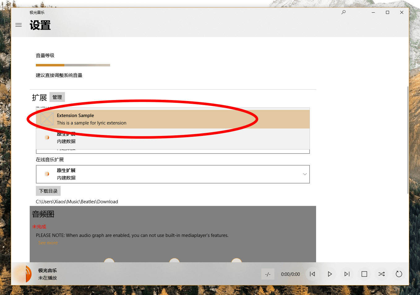 This sample introduces how to implement an extension for Aurora Music. A brief tutorial is announced here.