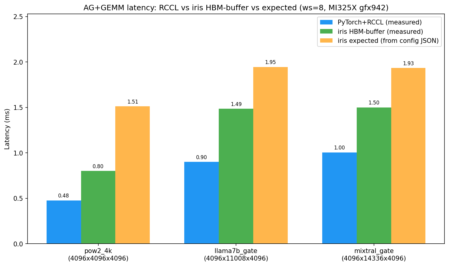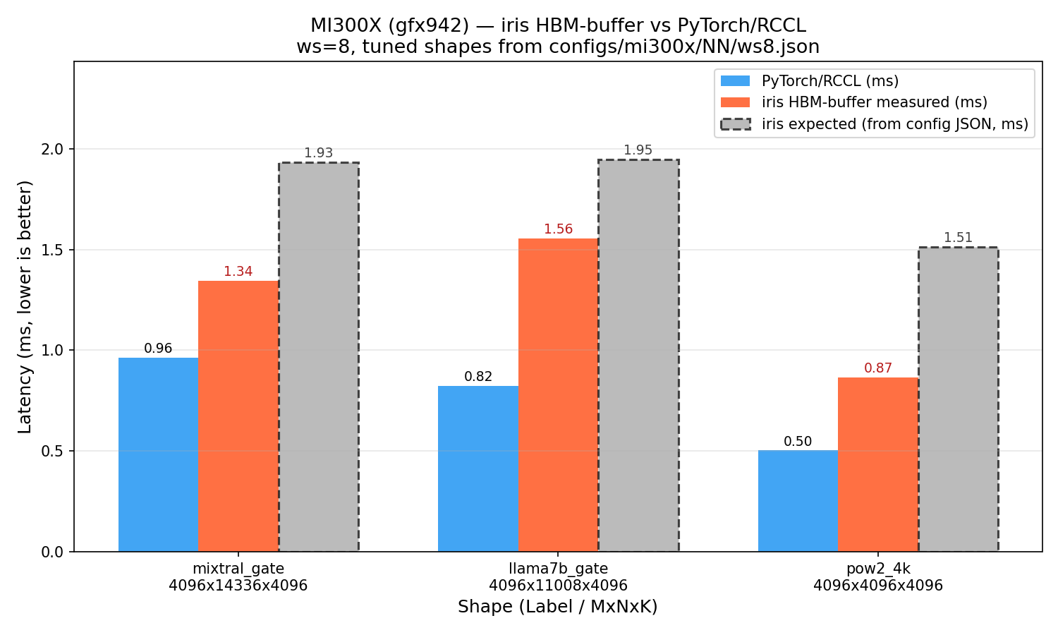 With the corrected RCCL baseline, RCCL is faster than iris for these small M=4096 shapes at ws=8 — consistent with the auto-config's assessment that iris overhead exceeds benefit for small M. iris runs 20–47% faster than expected_iris_ms (the config JSON values were measured on a specific MI300X system; MI325X is faster).