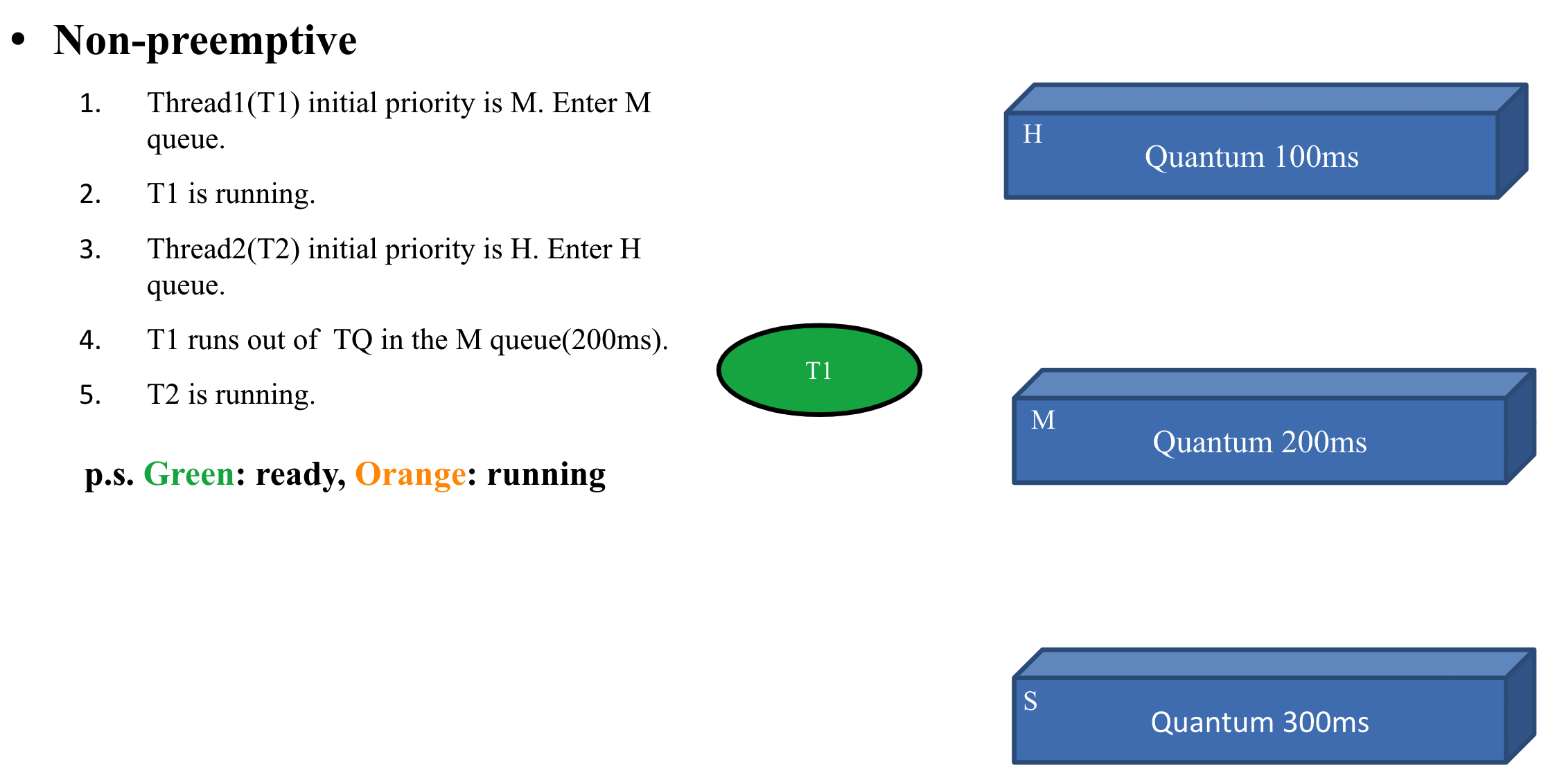 If a thread with a higher priority than the currently running thread enters the ready queue, it must wait for the running thread to run out of TQ or voluntarily give up the CPU before switching to a higher thread.