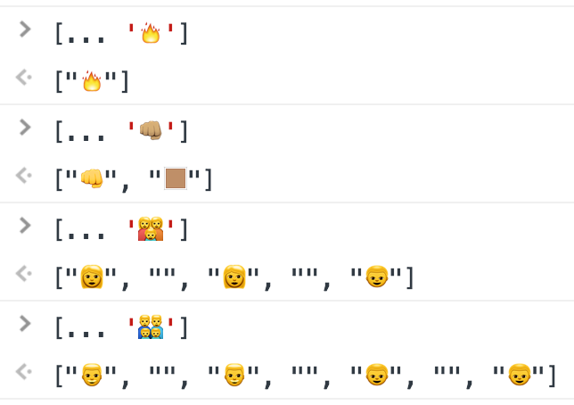 You can use JavaScript's spread operator to expand these emojis to see what their base components are. Here is a screenshot of a few that I expanded from Chrome's dev tools.