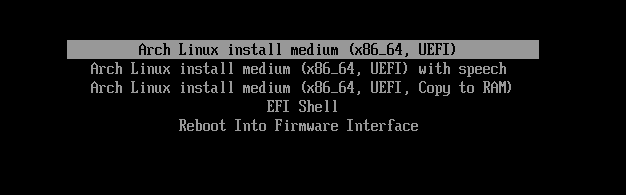 - Boot your machine and from the boot menu, select the arch linux iso to open up to a menu which looks like the following.