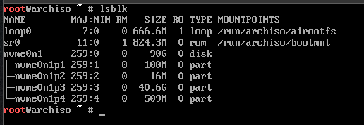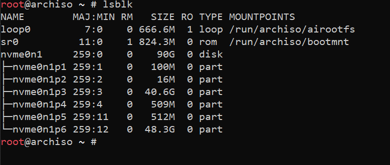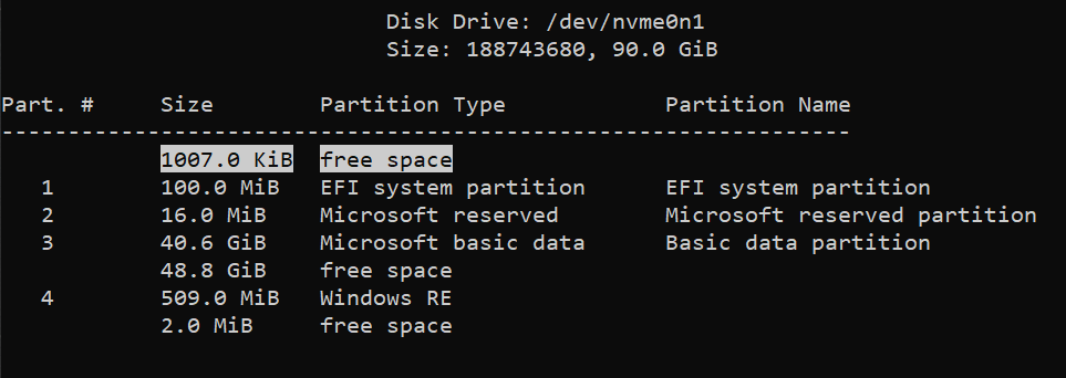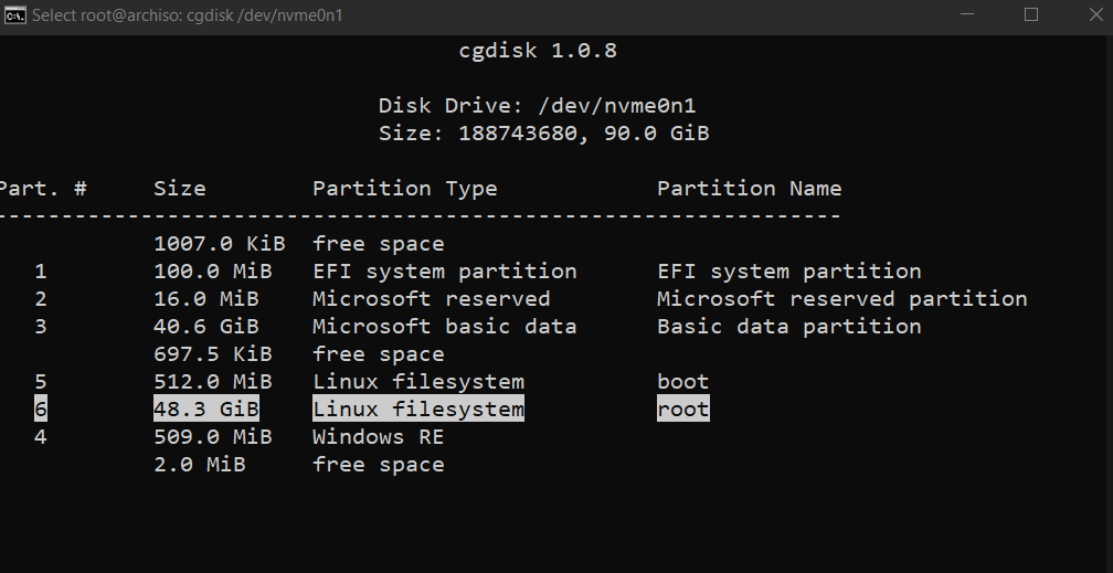 - Above is an example of how the output may look. Do not touch the EFI System partition or microsoft/windows partitions. The only partition we are worried about is the free space partition we created earlier, the 48.8 GiB is the largest free space partition and the one I chose to have arch linux.