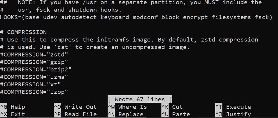 cryptdevice=PARTUUID={YOUR PART UUID HERE}:root root=/dev/mapper/rootreplacing the text inside the {} and the {} themselves with the Partuuid you saved on step 11. You canctrl-kandctrl-uto cut and paste. - Save and quit with