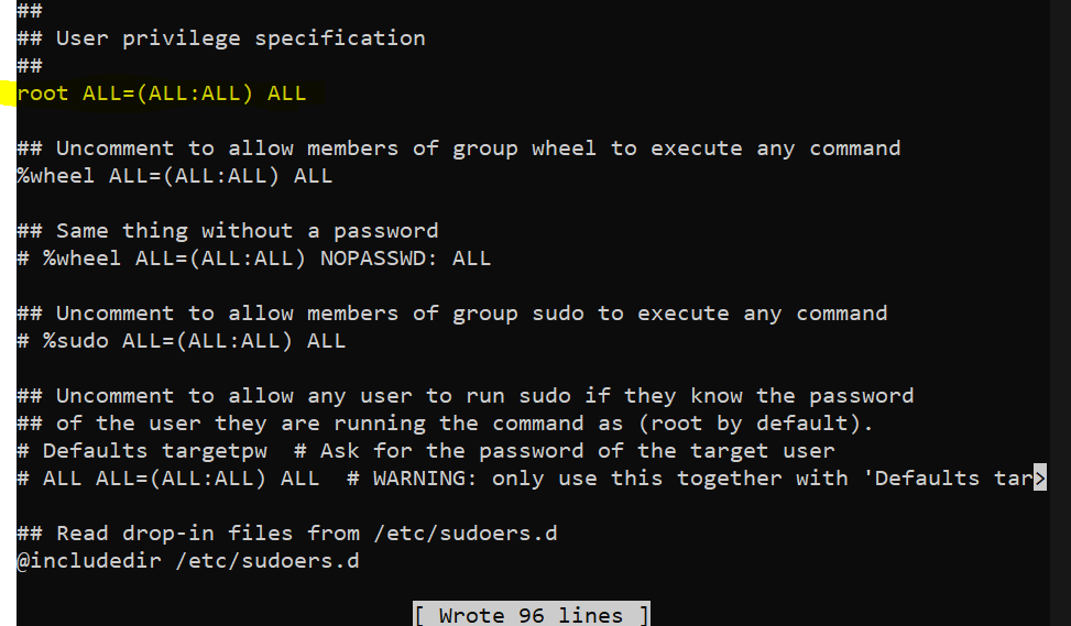 EDITOR=nano visudoor whatever editor you choose to allow users of the wheel group to use sudo by uncommenting the line%wheel ALL=(ALL:ALL) ALL