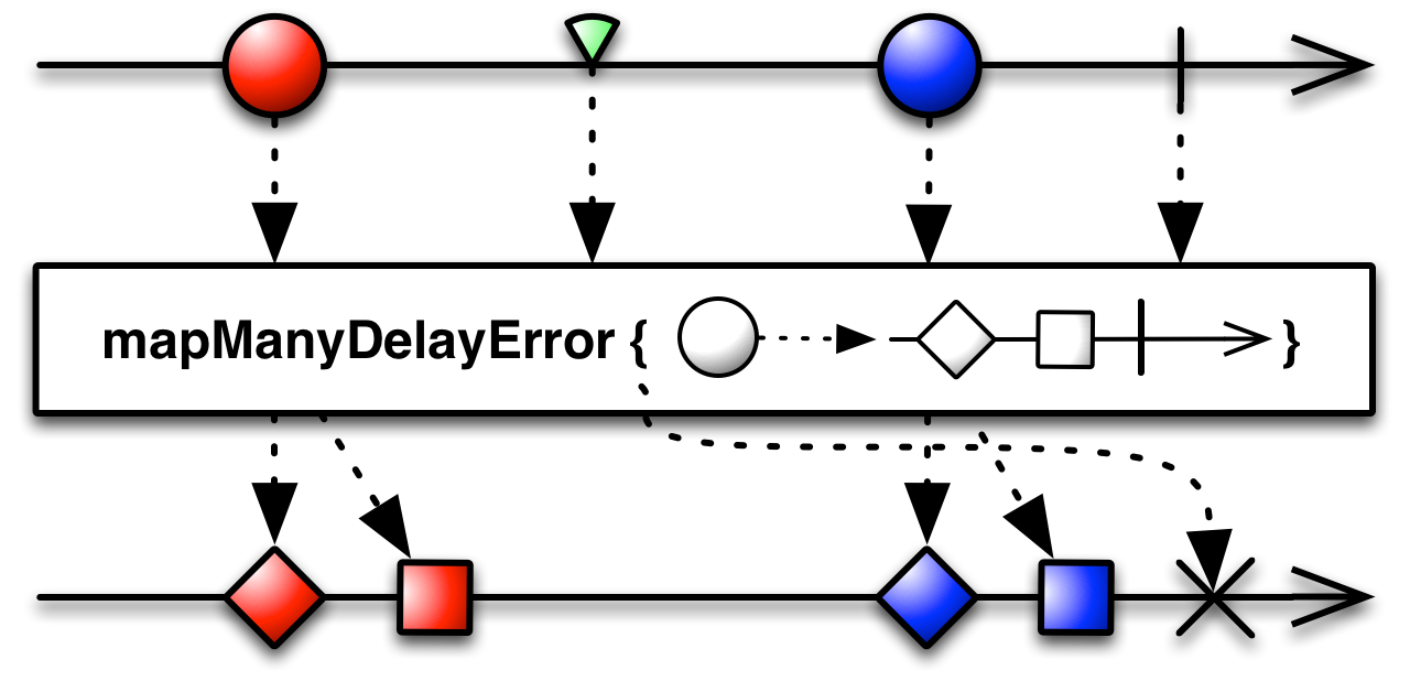 If any of the individual Observables mapped to the items from the source Observable in mapMany( ) aborts by invoking onError, the mapMany( ) call itself will immediately abort and invoke onError. If you would prefer that the map-many operation continue emitting the results of the remaining, error-free Observables before reporting the error, use mapManyDelayError( ) instead.