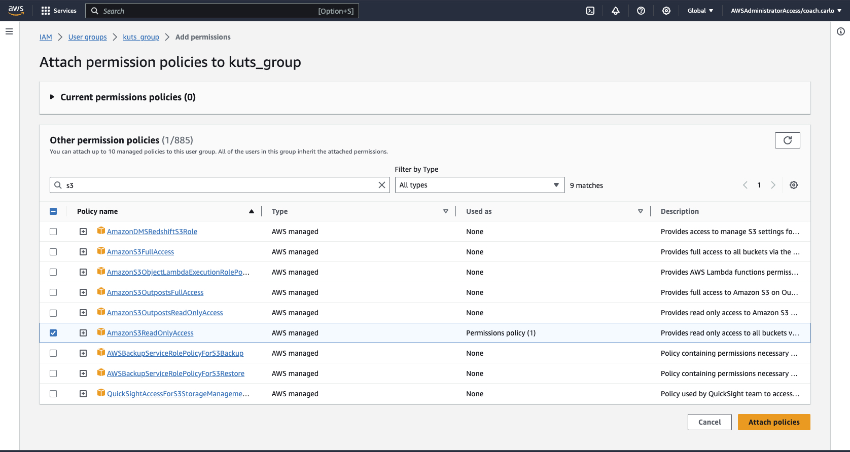 1-d Scroll down and look for AmazonS3ReadOnlyAccess and attach the permission policy to the group. This is the advantage of putting users inside a user group. It makes it easier to attach and remove permission to group of users instead of attaching/removing it one at a time.