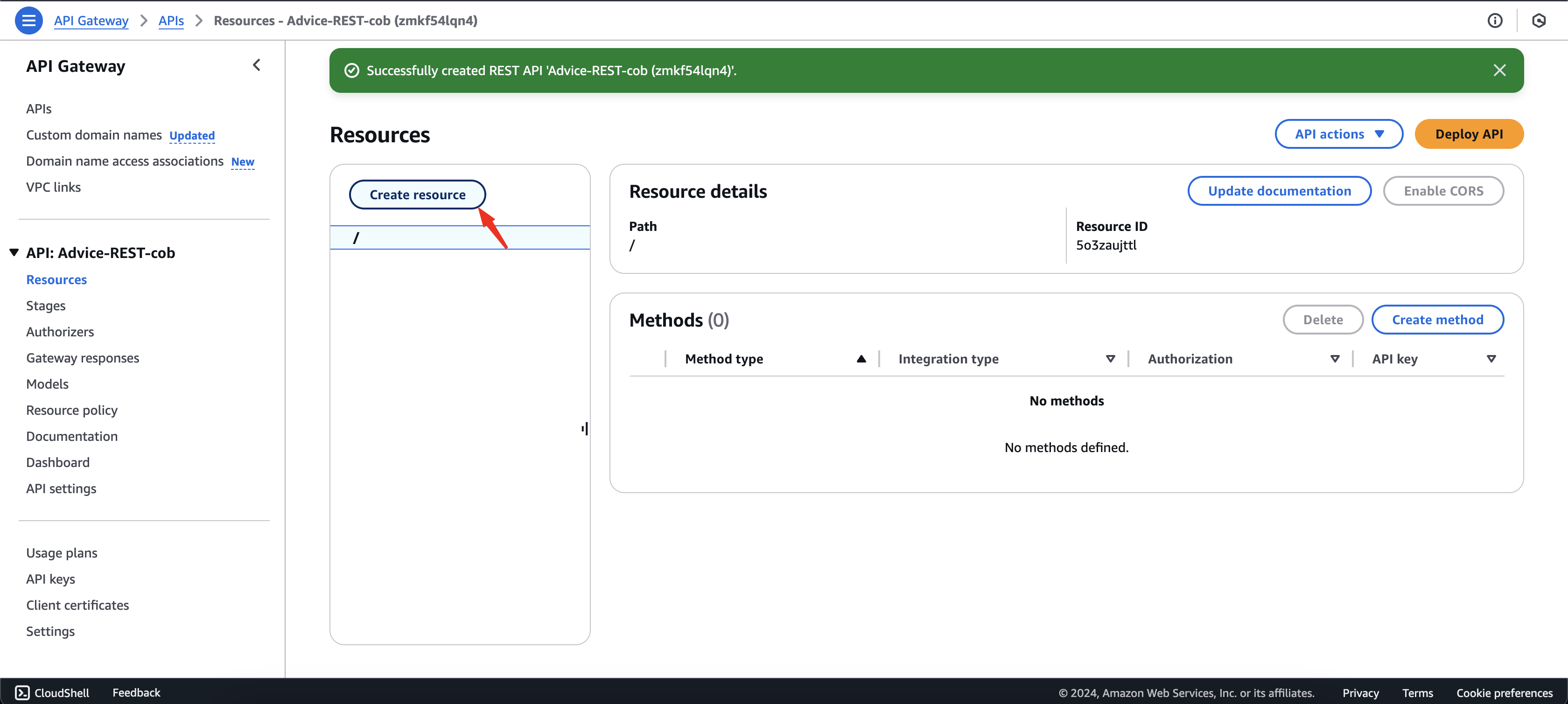 - In the Resources section, click Actions > Create Resource.