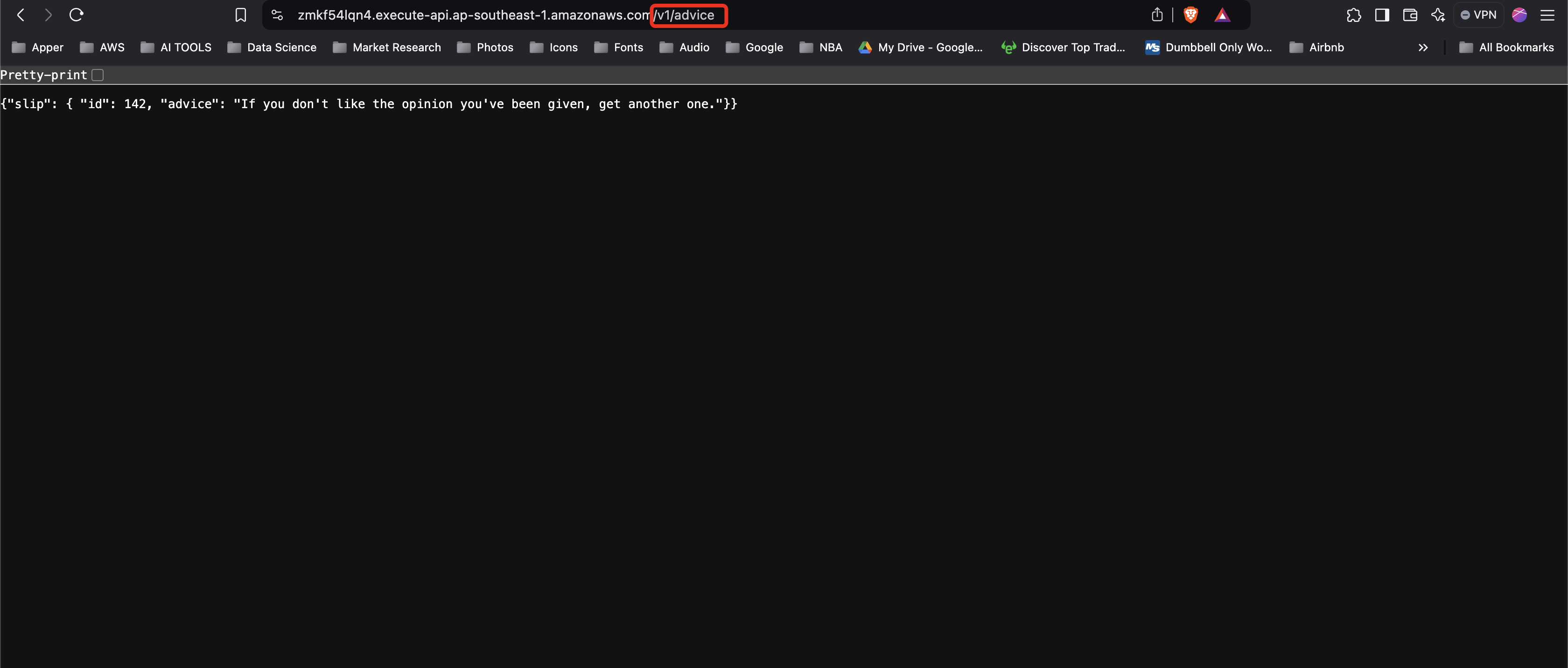 Try the api on a browser tab and adding v1/advice on the URL.