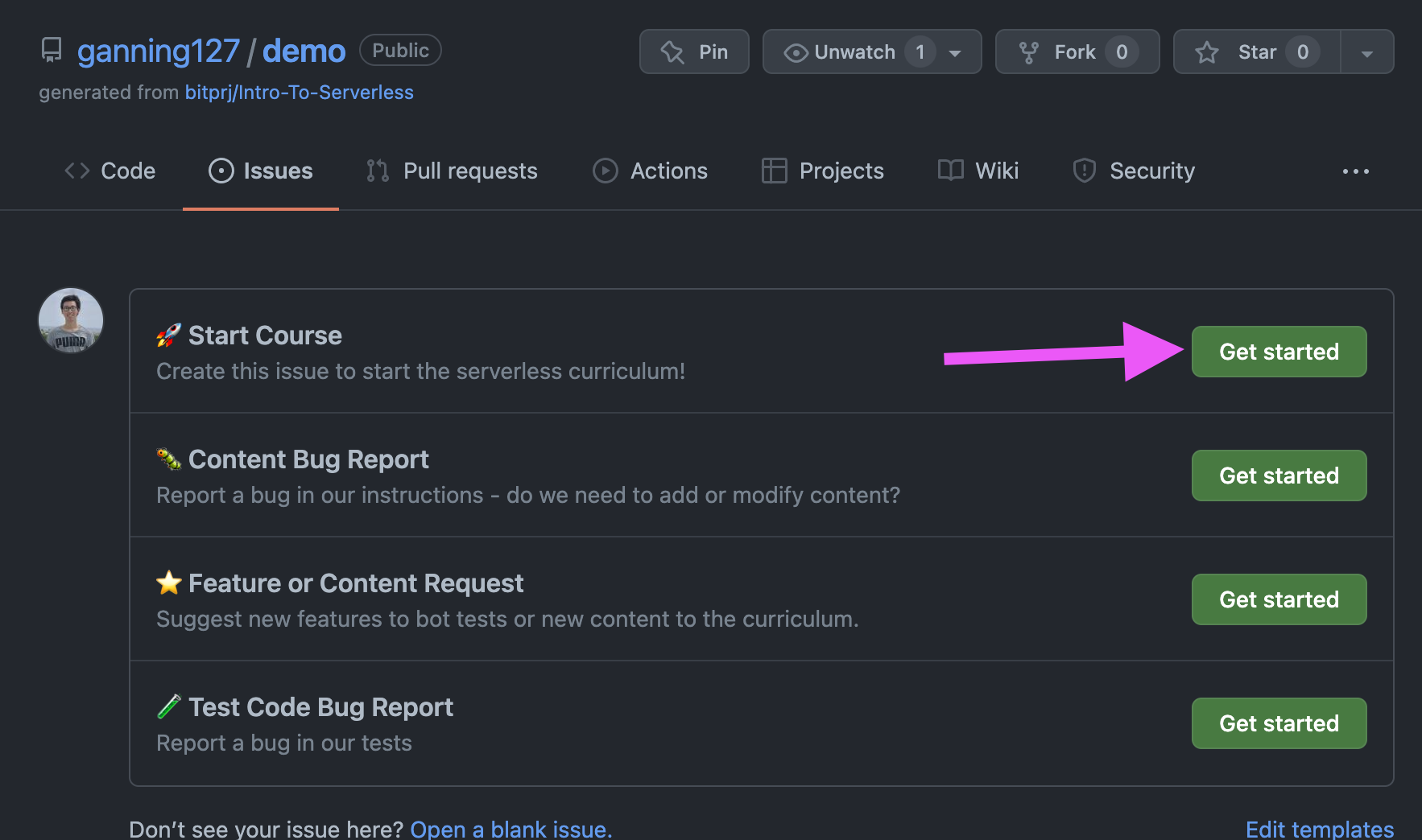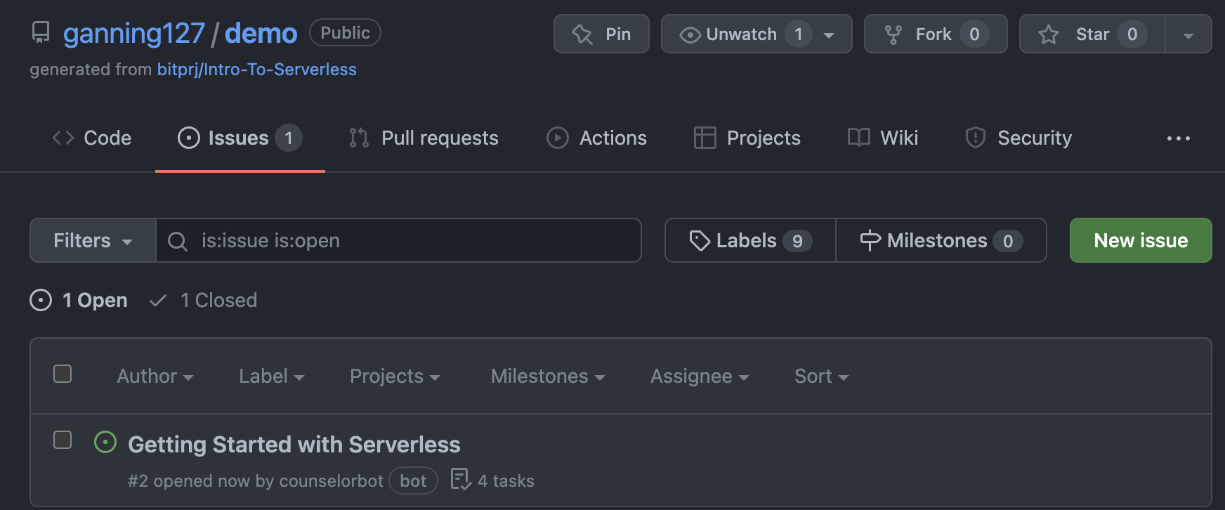 CounselorBot is a GitHub bot that will guide you through the Intro to Serverless Repository. Please follow these steps to get started!