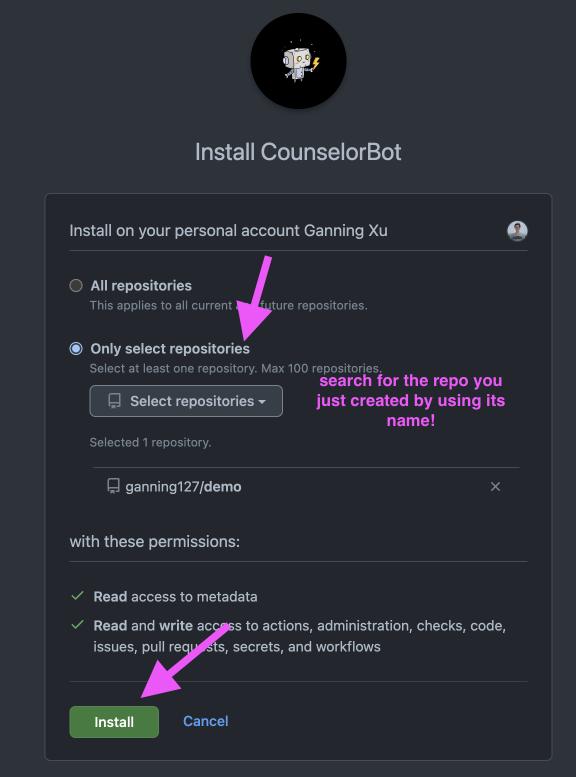 Select the option that says Only select repositories and search for the repo you just created by using its name! After that, click the Install button!