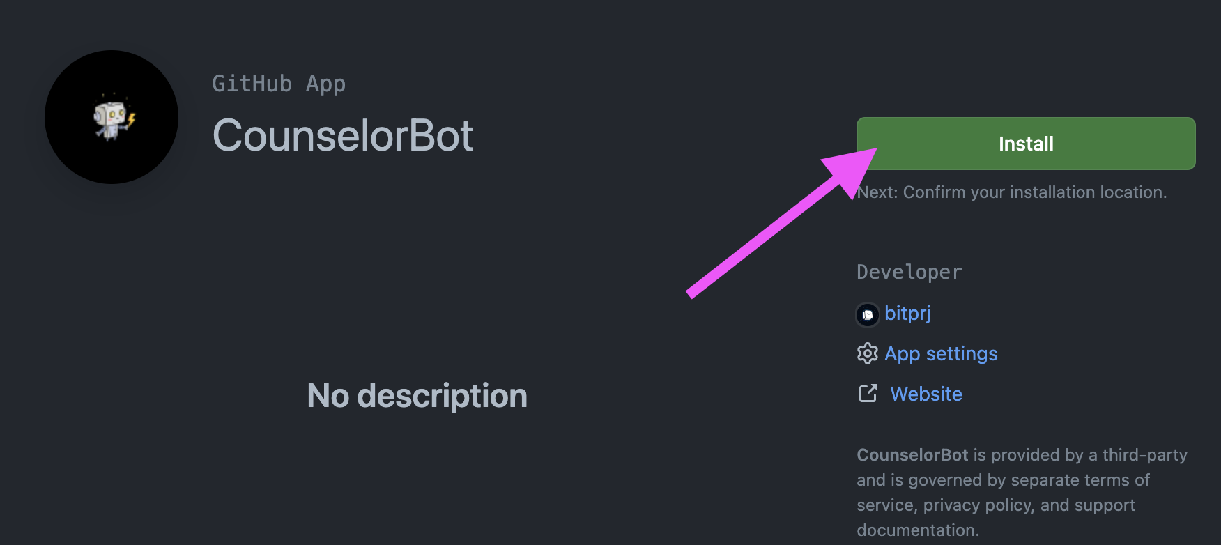 Your serverless repository has been created! Now let's install CounselorBot. You can download CounselorBot from GitHub Apps.