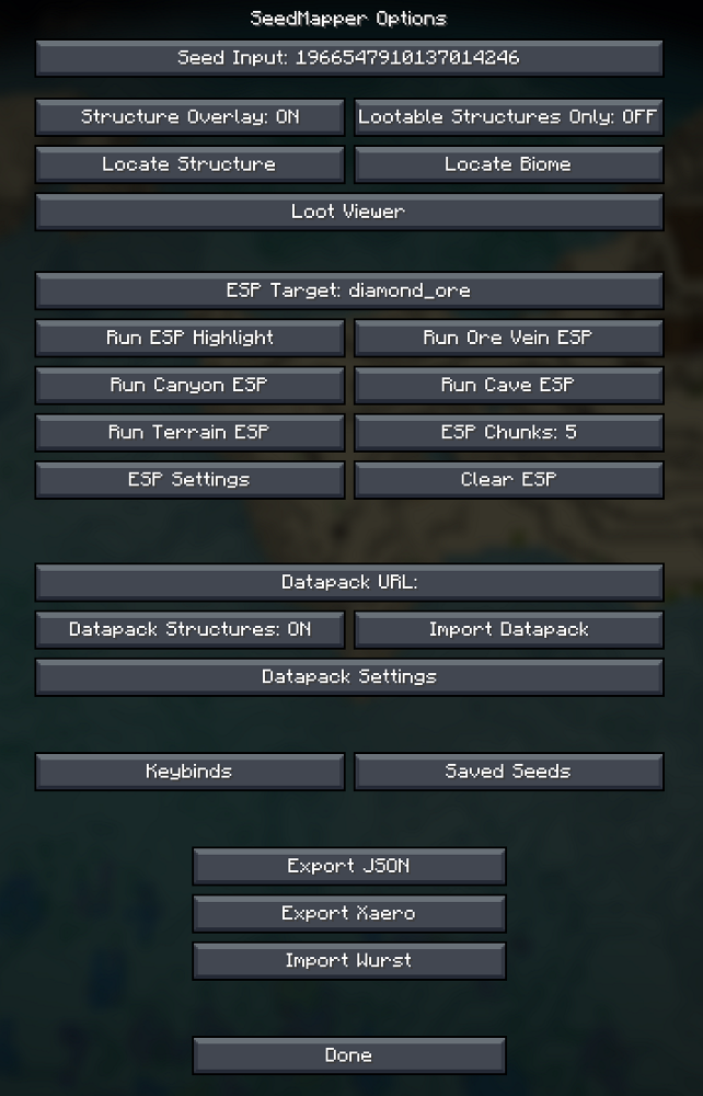 You are now able to easily access almost all functionality of SeedMapper via its options menu. There are also new keybinds you can assign and change from within.