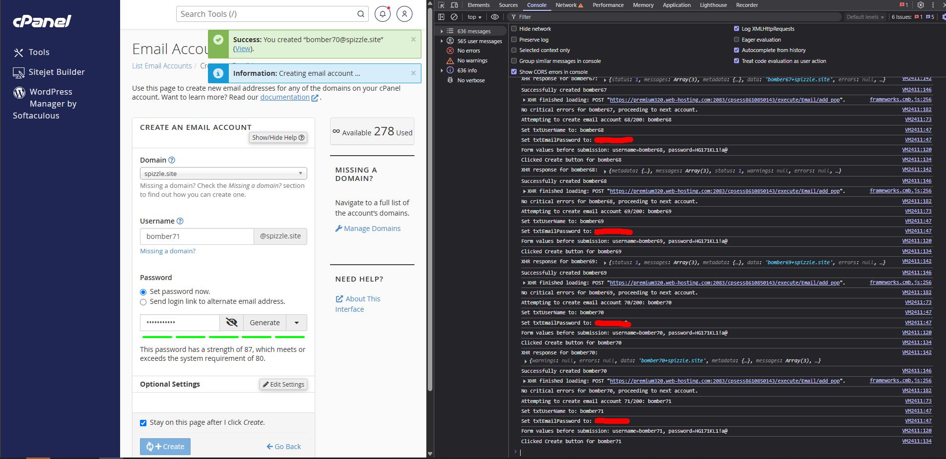 This script automates the creation of multiple email accounts on a web hosting control panel (cPanel-based UI) directly from the browser.