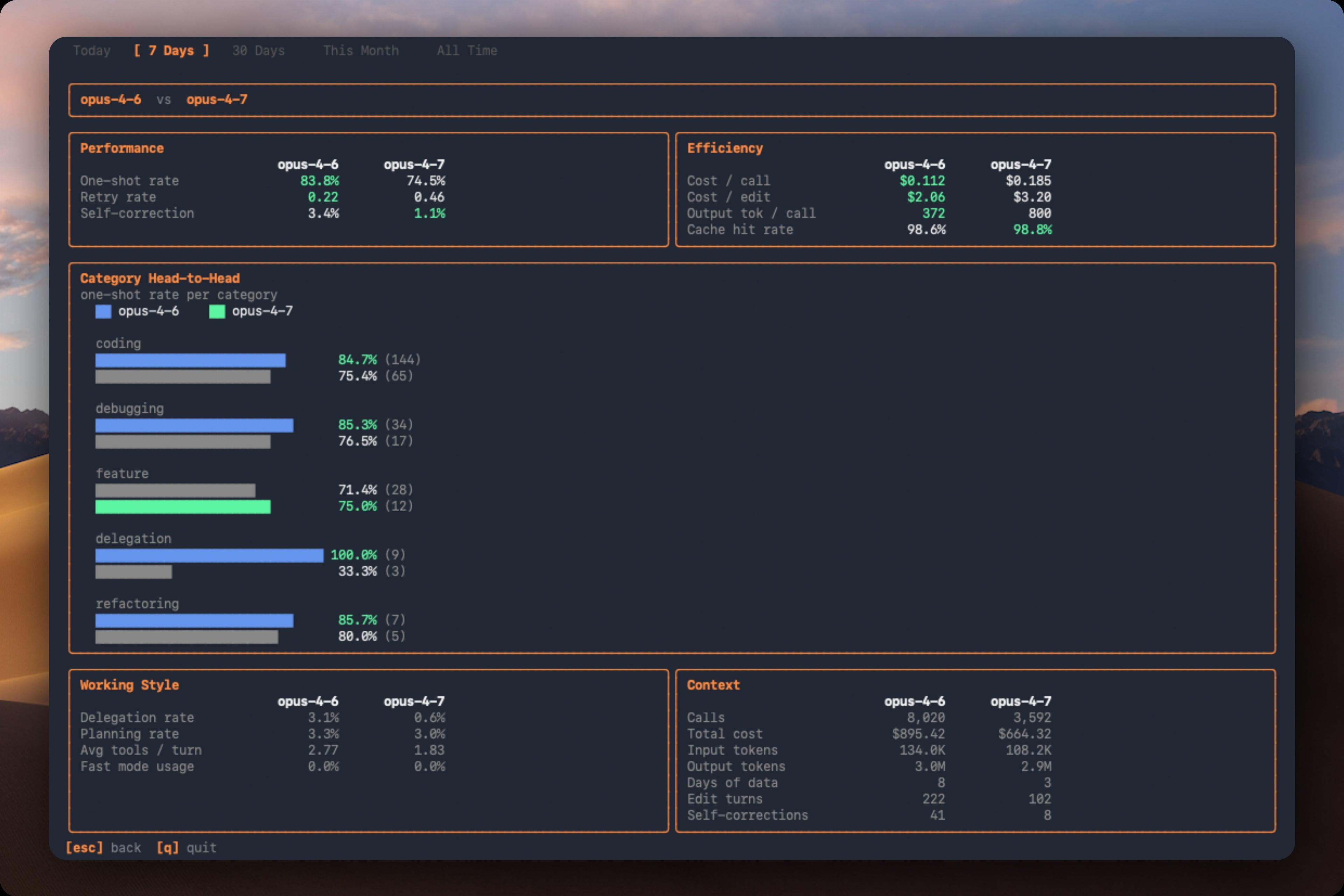 For categories that involve code edits, CodeBurn detects edit/test/fix retry cycles (Edit, Bash, Edit patterns). The one-shot column shows the percentage of edit turns that succeeded without retries. Coding at 90% means the AI got it right first try 9 out of 10 times.