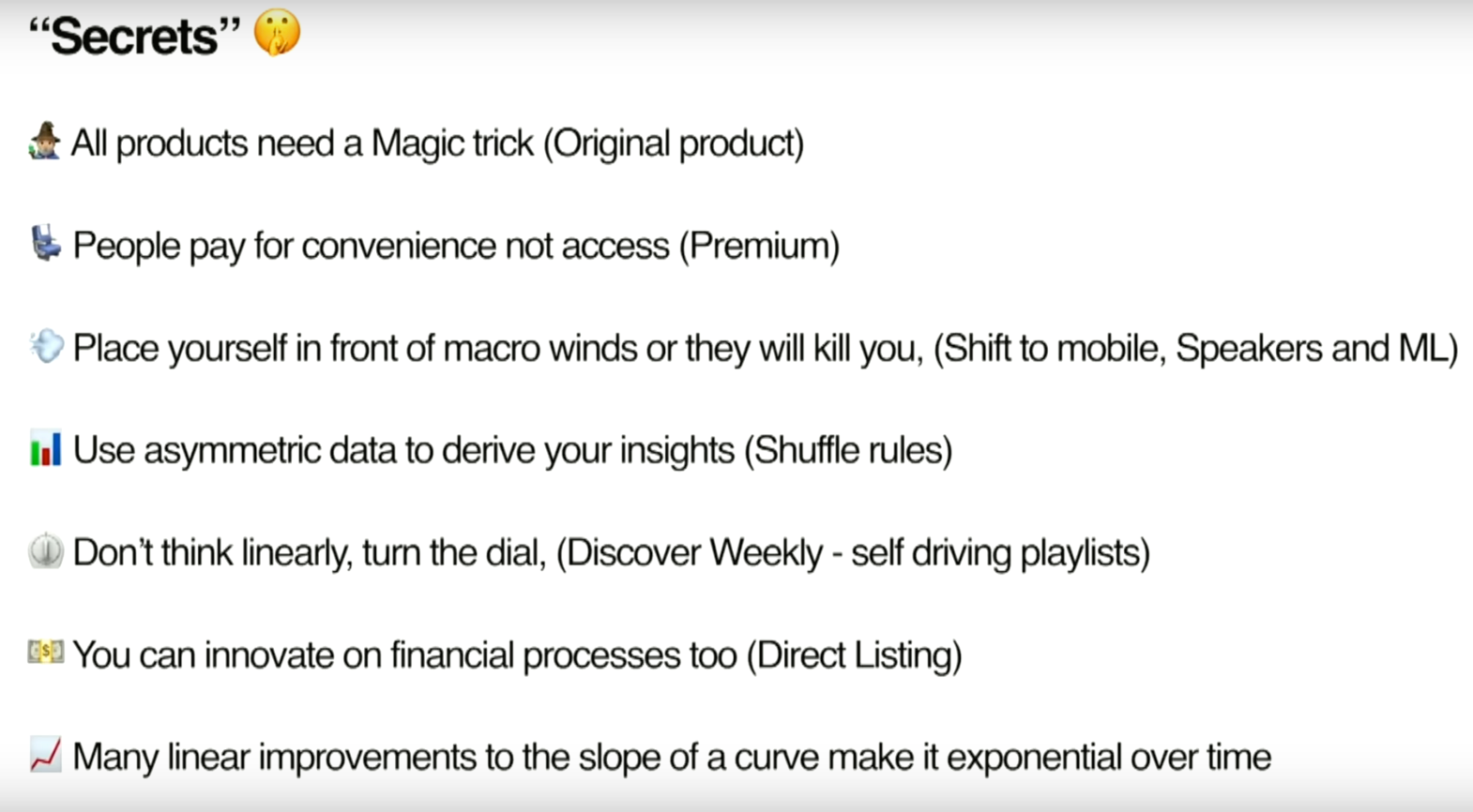 - Go slow until you have a great product. Then go fast. The economic efficiency gains from a great product compound everywhere. If you go fast too early, you will fail. Once you have nailed product, go so fast that it scares everyone. If you don’t go fast enough, you will fail.