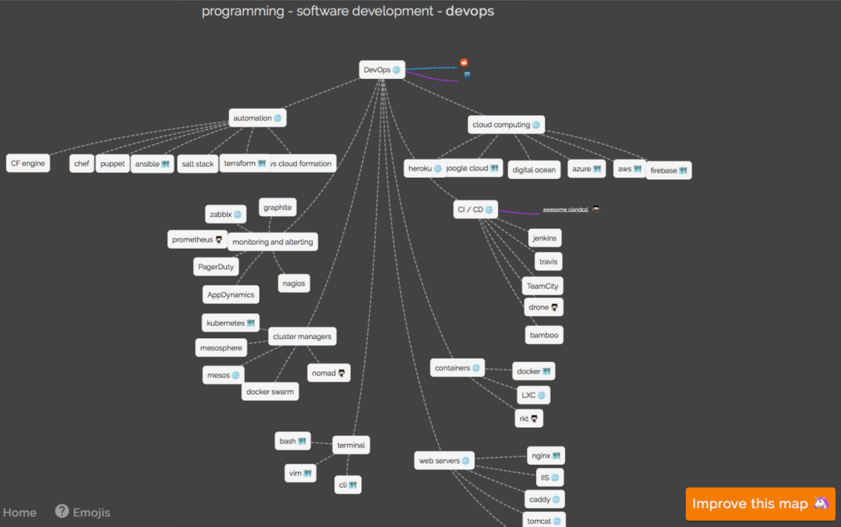 After many struggles Angelo managed to render the maps inline on the website itself. No more MindNode. Devops was always the map we tested our render on because it was unlike any other map. I added the 🦄 button but the contribution process was painful as people had to edit JSON files.