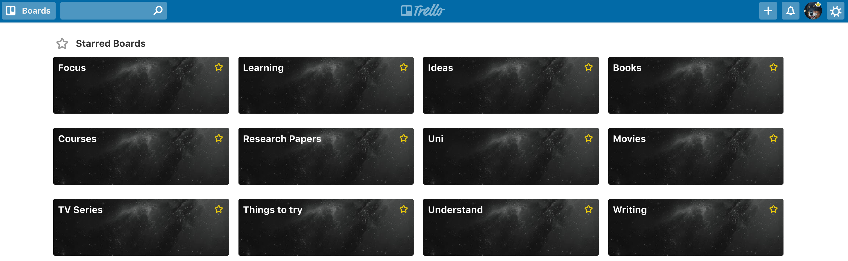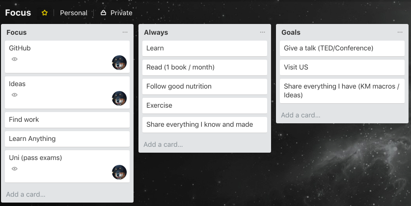 Only one board there is private. The Focus board. This is where I try to align my life to things I need to be doing and focusing on as my time and energy is limited. Here is how it looks now: