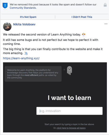 Learn Anything was banned from both Facebook and Instagram platforms.