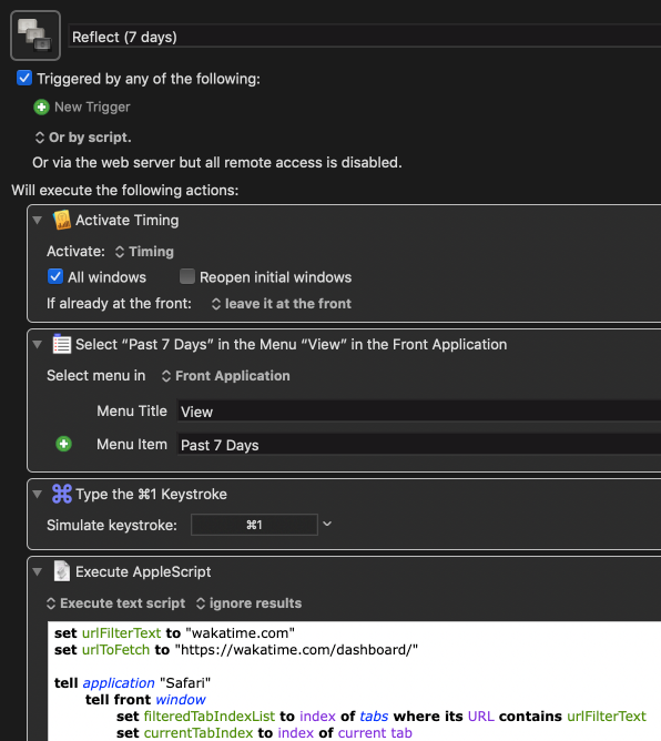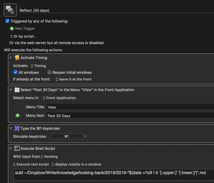 The 7 day reflection also opens this journal entry. It's just nice to make data driven analysis rather than relying on pure memory. Need to be more actionable with data I do collect. And especially need to be more actionable in how I spend my time. I have found my existing workflow I have to work well. Just misses a few tools to fill the rough edges like ability to search through my Pocket list from Alfred.