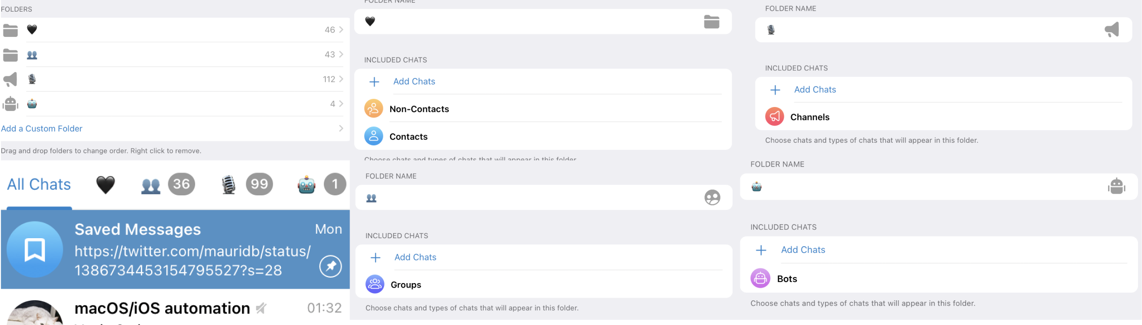 I can then on macOS use ⌘ + 1/2/3 to switch between the folders. And on iOS, swipe left and right or click. The folders are: Personal Messages (1 to 1 chats), Groups, Channels, Bots.
