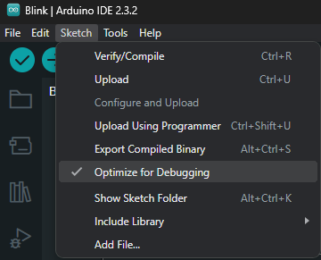 - In the Arduino IDE, go to Tools->Optimize->Debug. This will include -g in the compilation process, including debug symbols