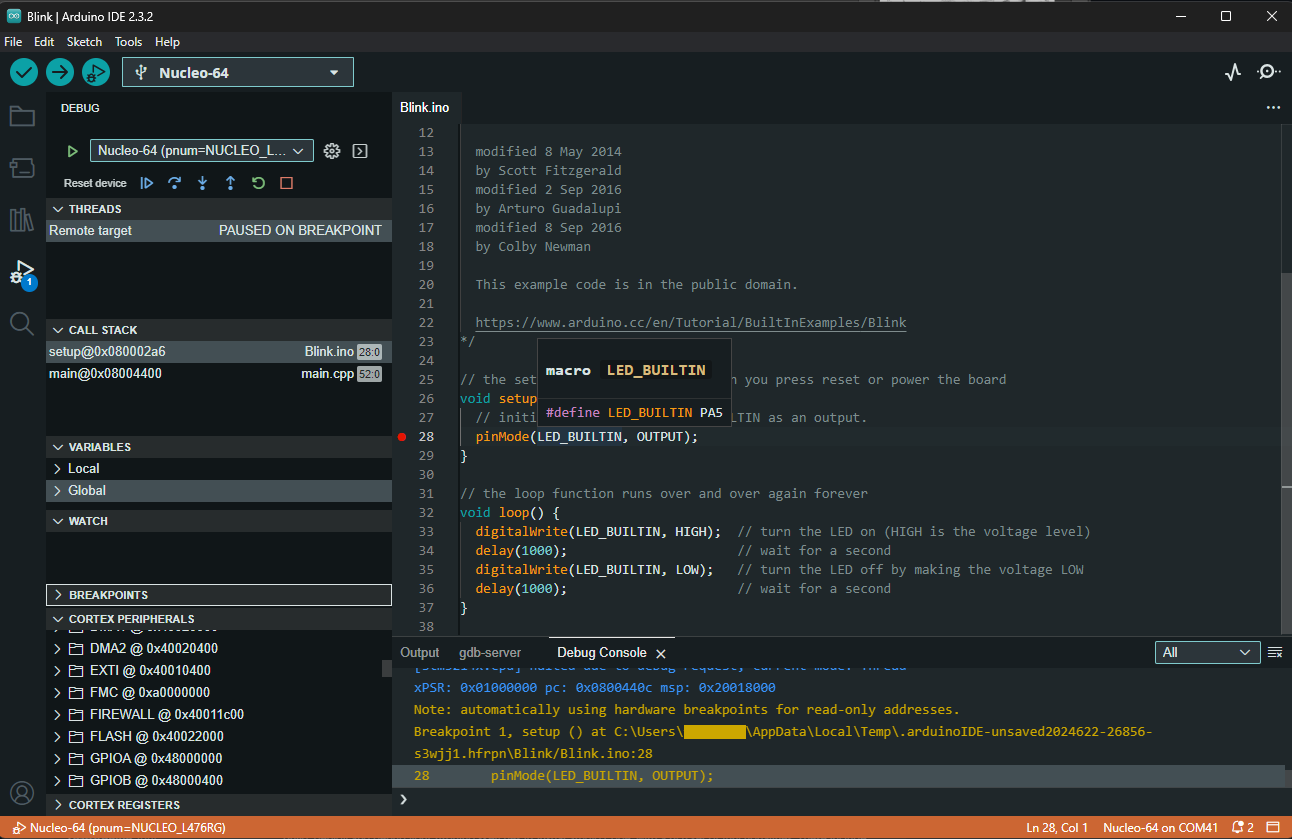 ~/.arduino15/packages/STM32/tools/xpack-arm-none-eabi-gcc/9.2.1-1.1/bin/arm-none-eabi-gdb /tmp/arduino_build_742171/Blink-stm32.ino.elfto run the gdb used by stm32duino. Note that the path to the ELF file was figure out in the compilation messages in the Arduino IDE, shown in the previous section. - Now in the GDB console, run the following commands: