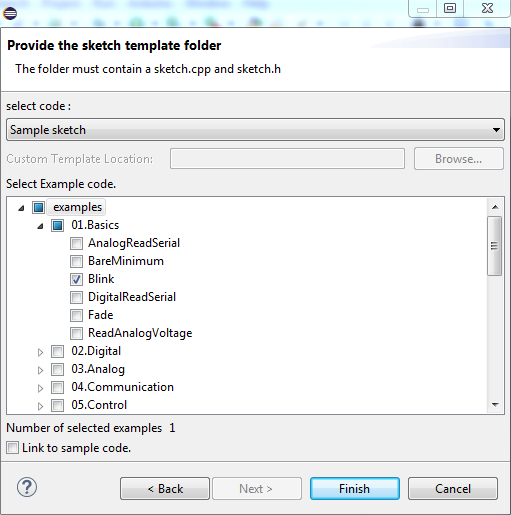 From the “select code” bar, apply “Sample sketch” and then choose “Examples > 01.Basics > Blink” and “Finish”.