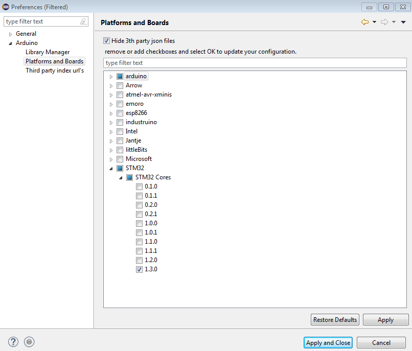 Hit “Apply and Close” then re-open the “Arduino > Preferences” menu. The STM32 Core is now available in the “Platforms and Boards” menu.