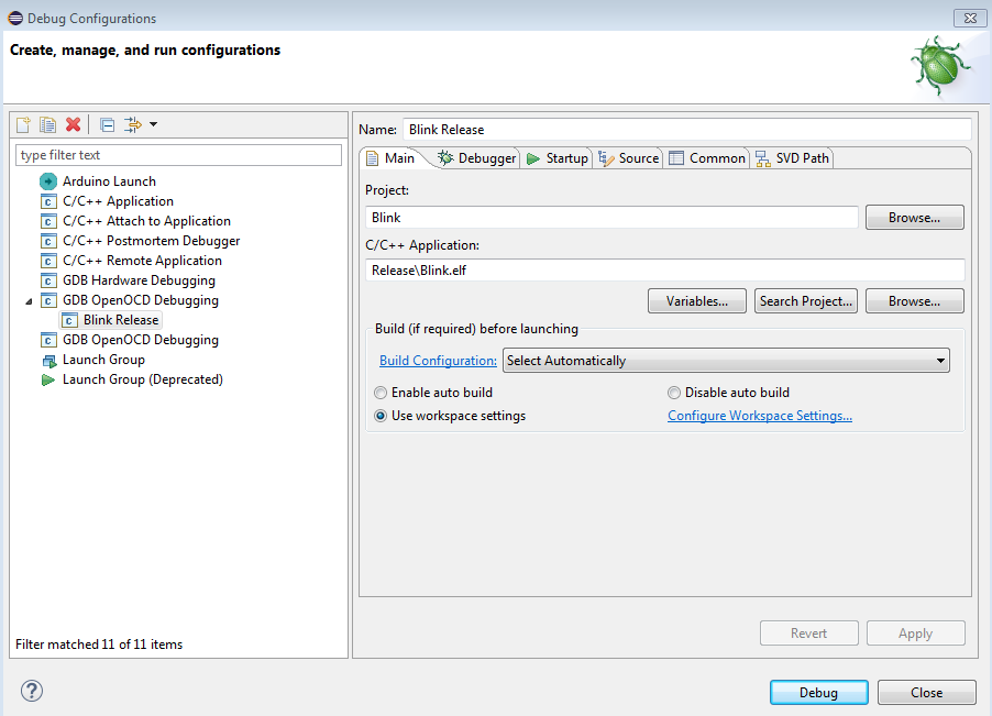 Move to the “Debugger” tab in order to configure OpenOCD and GDB.