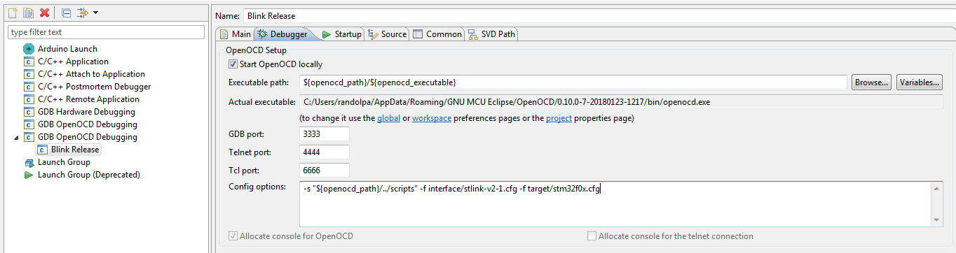 - First, set the OpenOCD executable path. If OpenOCD was installed following the recommended instructions from the GNU MCU plug-in installation guide (see section 1.1.1), Eclipse should auto detect the latest version of OpenOCD and you should be able to use global variable to define your path. Your executable path should look like this one :