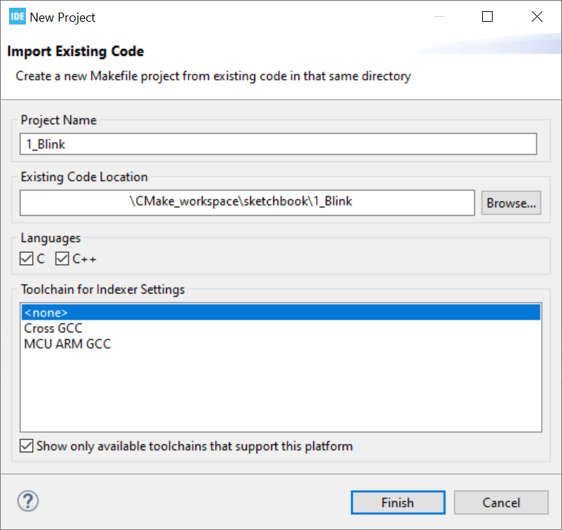 cmake -S [source folder] -B [build folder] -G NinjaFor the source and build folder, you can use one of Cube's automatic variables, such as ${workspace_loc:/1_Blink}/build, as in the project settings.