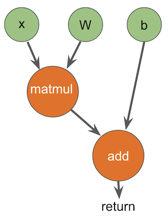 }Because we added so many constraints on what we accept, it is trivial to transform this into a graph through static analysis: we can do a top-down walk over the code. Each function parameter is turned into an input to the graph. Each operation is trivial to identify, and can be transformed 1-1 into graph nodes: given a top-down walk, inputs are already graph nodes, and the op name, inputs, and any attributes (which aren’t discussed here) are immediately available. Because we have no control flow, there is exactly one return instruction, and it designates the result of the graph.