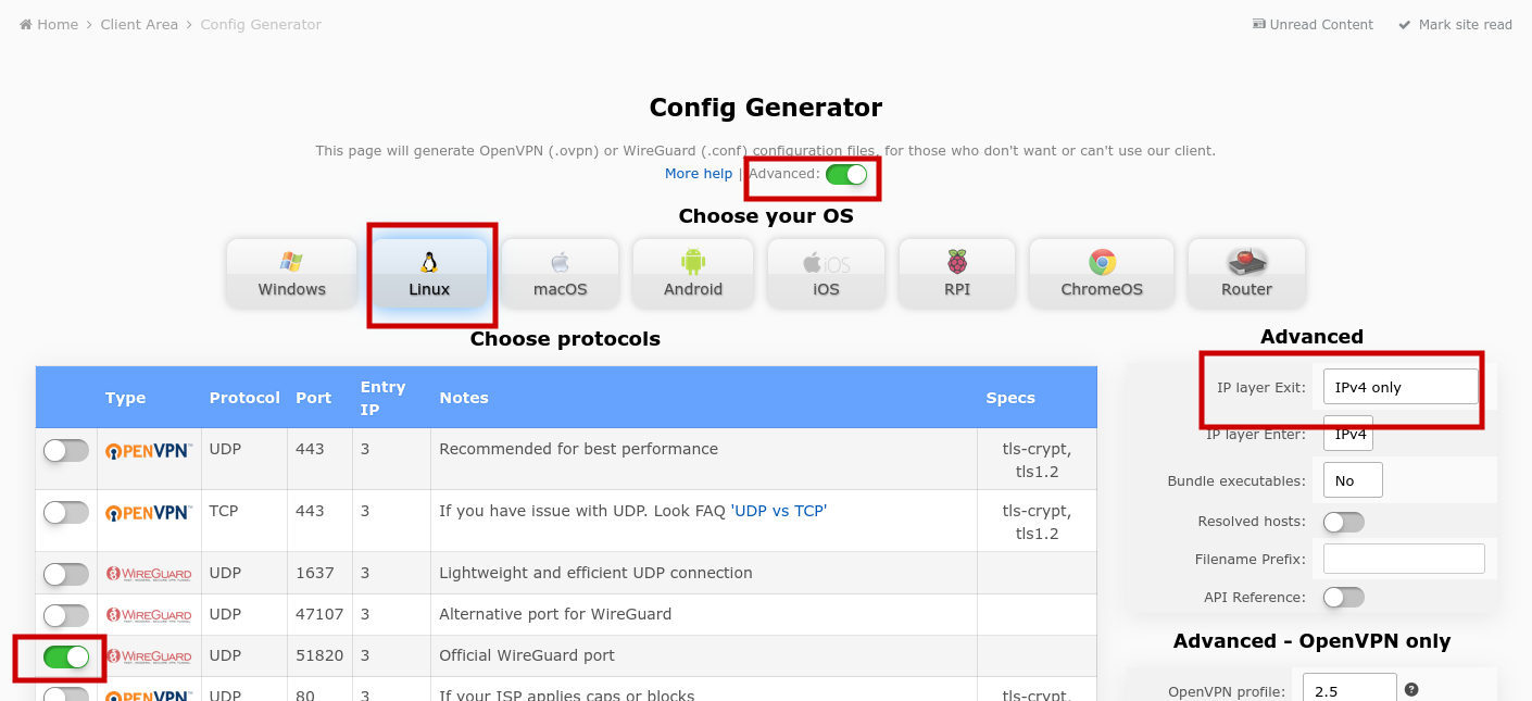 To use AirVPN, sign up and generate a Wireguard Configuration from the Client Area tab, then the Config Generator box (not the Eddie client).
