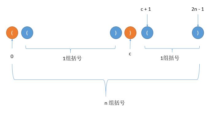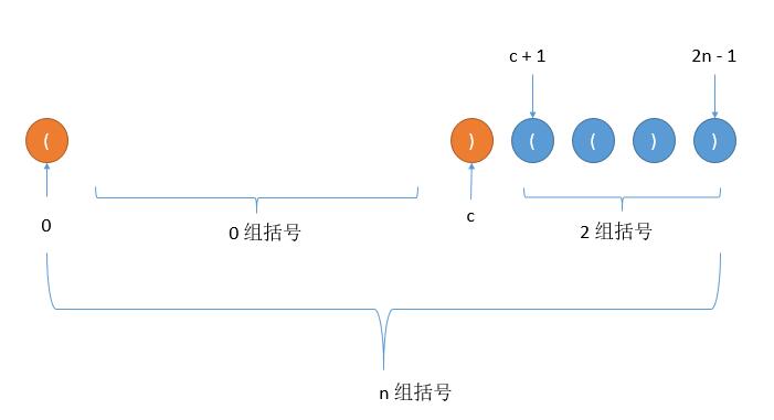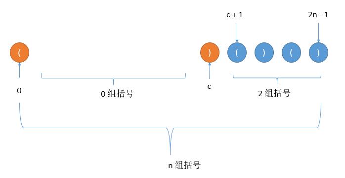 我们想一下之前的列举过程,第 0 个位置一定会是左括号,然后接着添加左括号或右括号,过程中左括号数一定大于或等于右括号数,当第一次出现左括号数等于右括号数的时候,假如此时的位置是 c 。那么位置 1 到 c - 1 之间一定是合法序列,此外 c + 1 到最后的 2n -1 也是合法序列。而假设总共是 n 组括号,1 到 c - 1 是 a 组括号, c + 1 到 2n - 1 之间则是 n - 1 - a 组括号,如下图