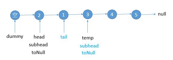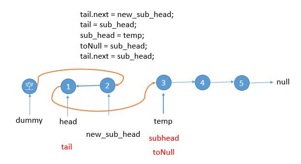 接下来四步分别是,新链表接到 tail(注意下边的图 tail 是更新后的位置,之前 tail 在 dummy 的位置) 的后边;更新 tail 到新链表的尾部,也就是之前的 subhead (下图 subhead 也是更新后的位置,之前的位置参见上边的图);sub_head 更新到 temp 的位置;toNull 到 sub_head 的位置;然后将新的尾部 tail 把之前断开的链表连起来,接到 sub_head 上。