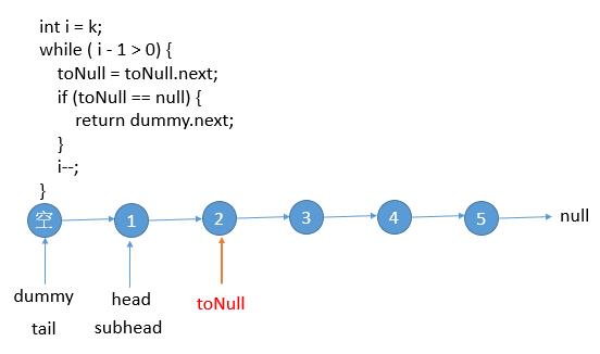 一个 while 循环,让 toNull 指针走 k - 1 步使其指向子链表的尾部。中间的 if 语句就是判断当前节点数够不够 k 个了,不够的话直接返回结果就可以了。