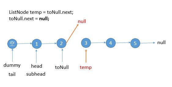 将子链表指向 null ,脱离出来。并且用 temp 保存下一个结点的位置。