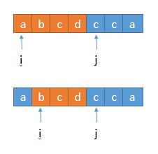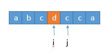 当 j 指向的 c 存在于前边的子串 abcd 中,此时 i 向前移到 b ,此时子串中仍然含有 c,还得继续移动,所以这里其实可以优化。我们可以一步到位,直接移动到子串 c 的位置的下一位!