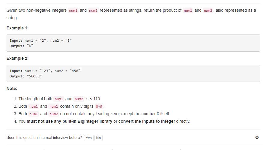 就是两个数相乘,输出结果,只不过数字很大很大,都是用 String 存储的。也就是传说中的大数相乘。