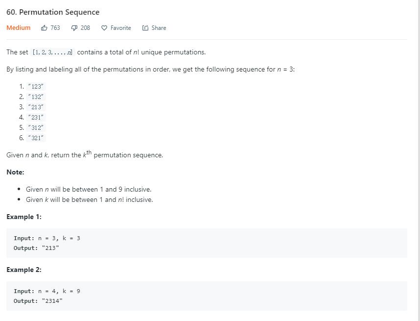 又是一道全排列的题,之前在31题,46题,也讨论过全排列问题的一些解法。这道题的话,是给一个 n,不是输出它的全排列,而是把所有组合从从小到大排列后,输出第 k 个。