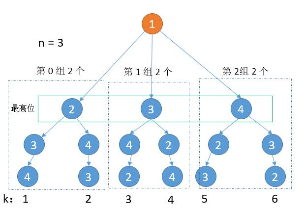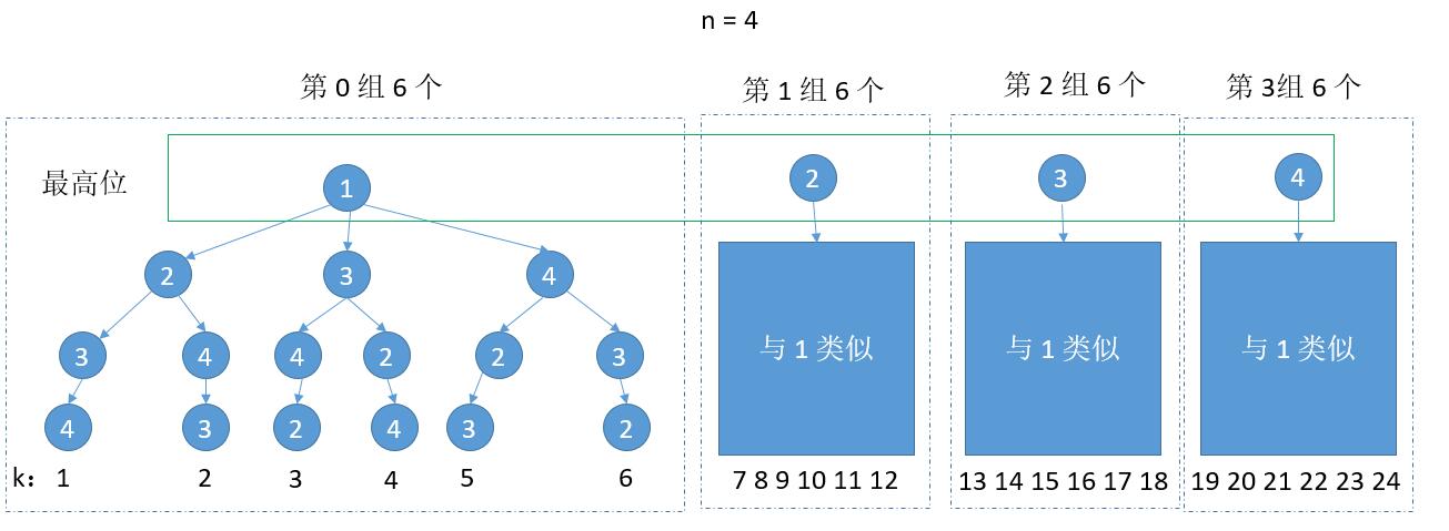 以 n = 4 为例,可以结合下图看一下。因为是从小到大排列,那么最高位一定是从 1 到 4。然后可以看成一组一组的,我们只需要求出组数,就知道最高位是多少了。而每组的个数就是 n - 1 的阶乘,也就是 3 的阶乘 6。