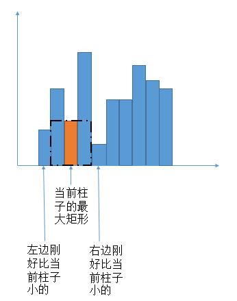 我们回想一下 leftLessMin [ ] 和 rightLessMin [ ] 的含义, leftLessMin [ i ] 代表左边第一个比当前柱子矮的下标,如下图橙色柱子时当前遍历的柱子。rightLessMin [ ] 时右边第一个。
