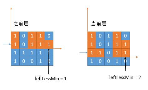 我们考虑最后一个柱子的更新。上一层的 leftLessMin = 1,也就是蓝色 0 的位置是第一个比它低的柱子。但是在当前层,由于中间出现了 0。所以不再是之前的 leftLessMin ,而是和上次出现 0 的位置进行比较(因为 0 一定比当前柱子小),谁的下标大,更接近当前柱子,就选择谁。上图中出现 0 的位置是 2,之前的 leftLessMin 是 1,选一个较大的,那就是 2 了。